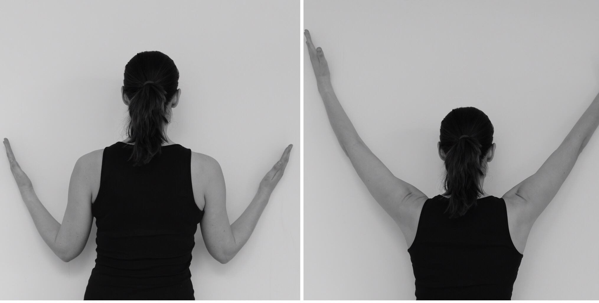 Shoulder shrugs – Face a wall and place the side of your hands on the wall (starting in the W position). Slide your hands up the wall (ending in the Y position). Shrug your shoulders up to your ears and lower them again. Repeat 10 times slowly